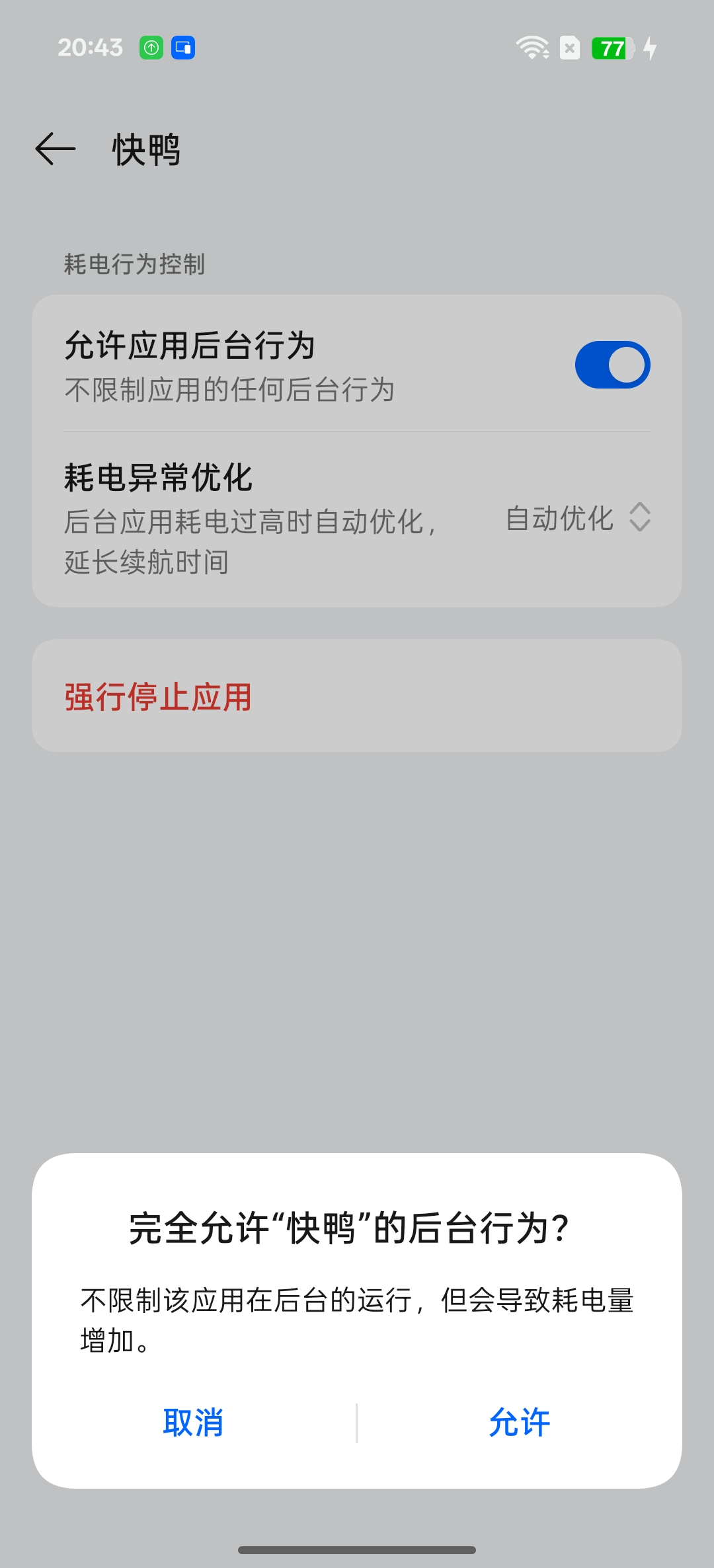在 ”应用管理“ 当中找到 ”快鸭“,然后将其 ”耗电保护“ 中的选项全部关闭;